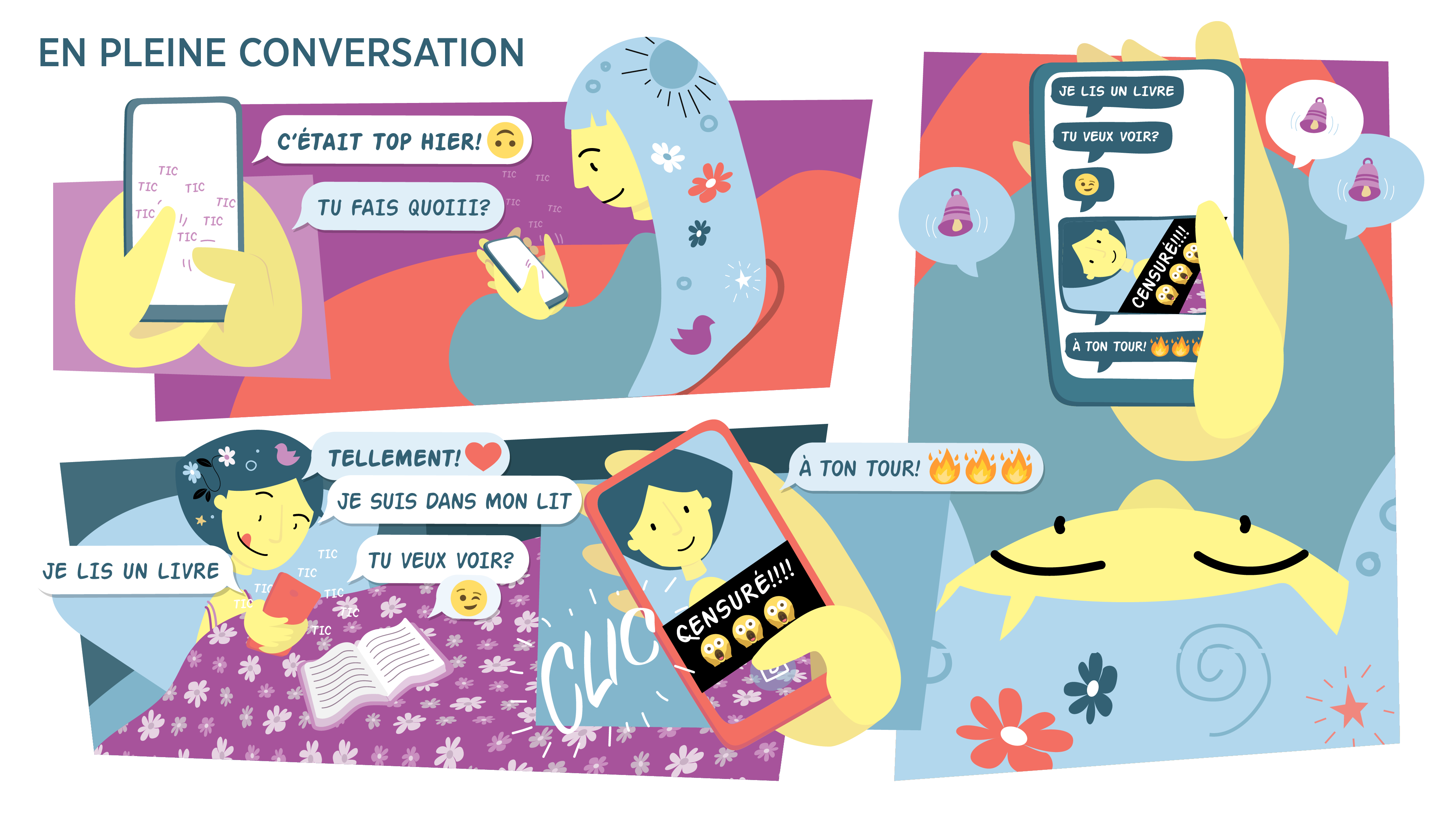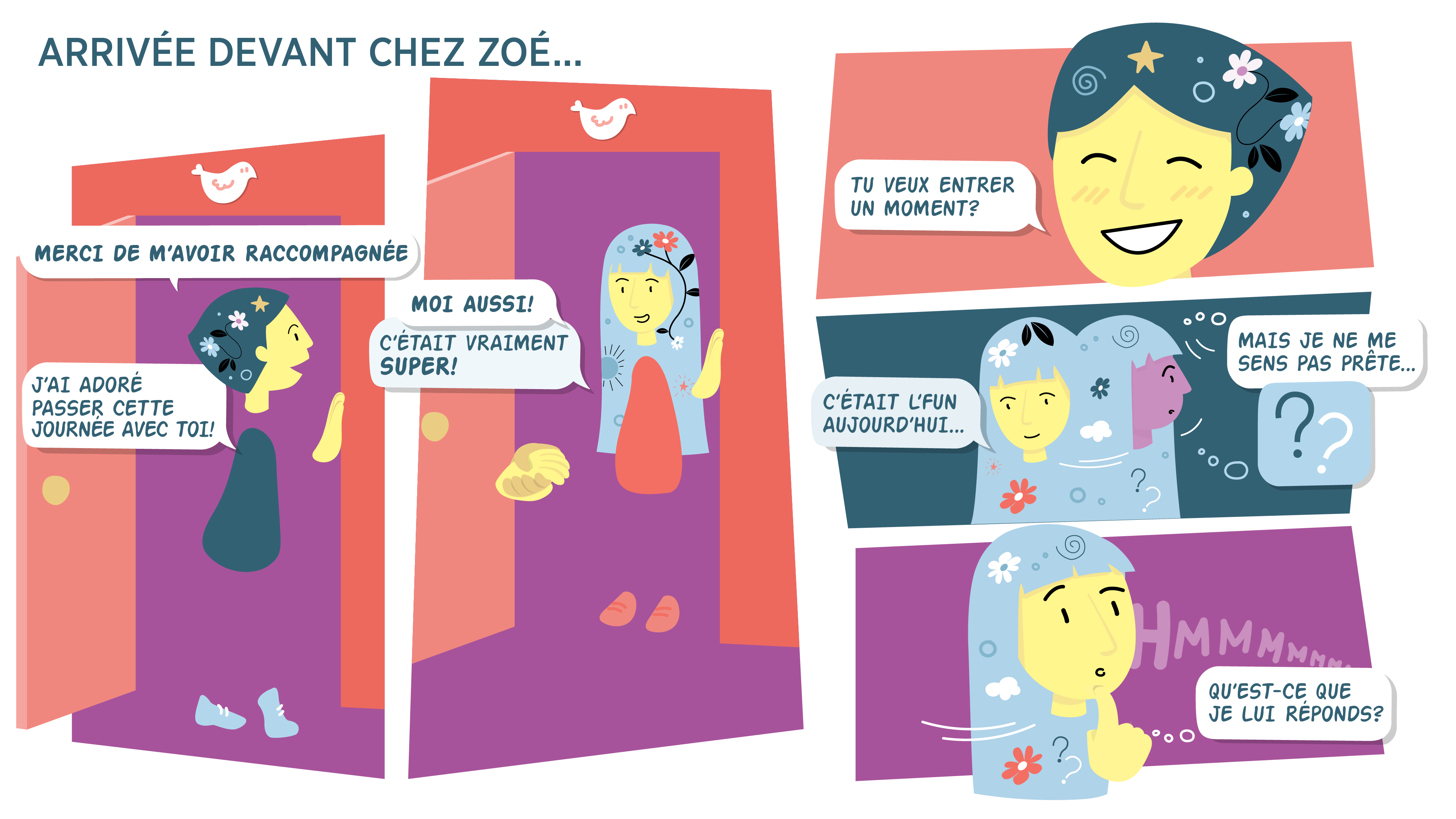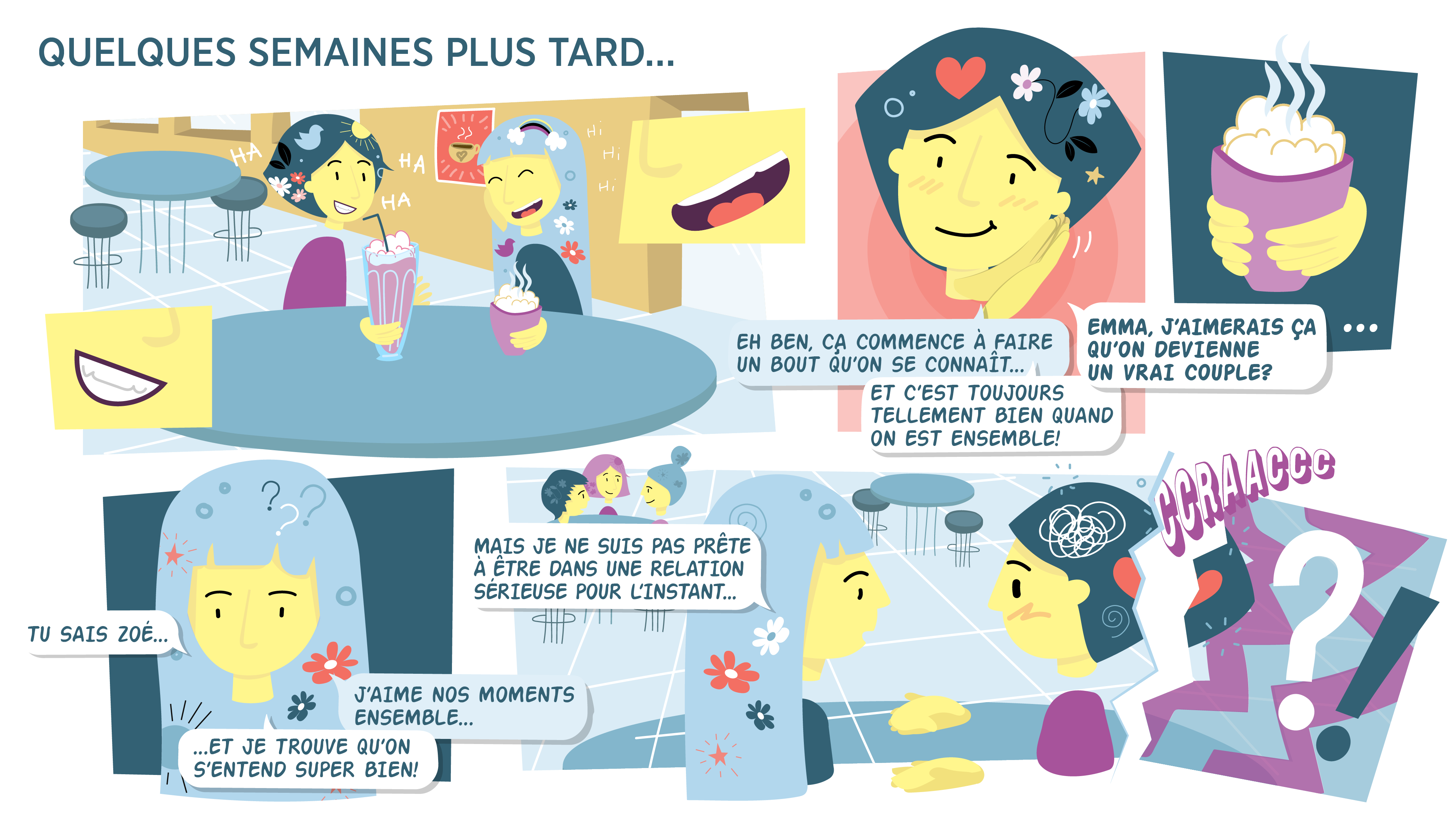 L’histoire d’Emma et de Zoé est fictive. Tu peux répondre comme tu veux, que ce soit inspiré de ta propre relation, de celle d’une personne que tu connais, ou tout simplement par curiosité. Amuse-toi à explorer les divers scénarios possibles et le type de relation que cela peut représenter.